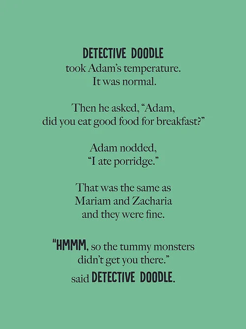 Adam didn’t like tummy monsters. But they were back! They made Adam feel ill. Adam’s Dad transforms into Detective Doodle to try to find out where they came from. What does he find? Will Adam feel better again?